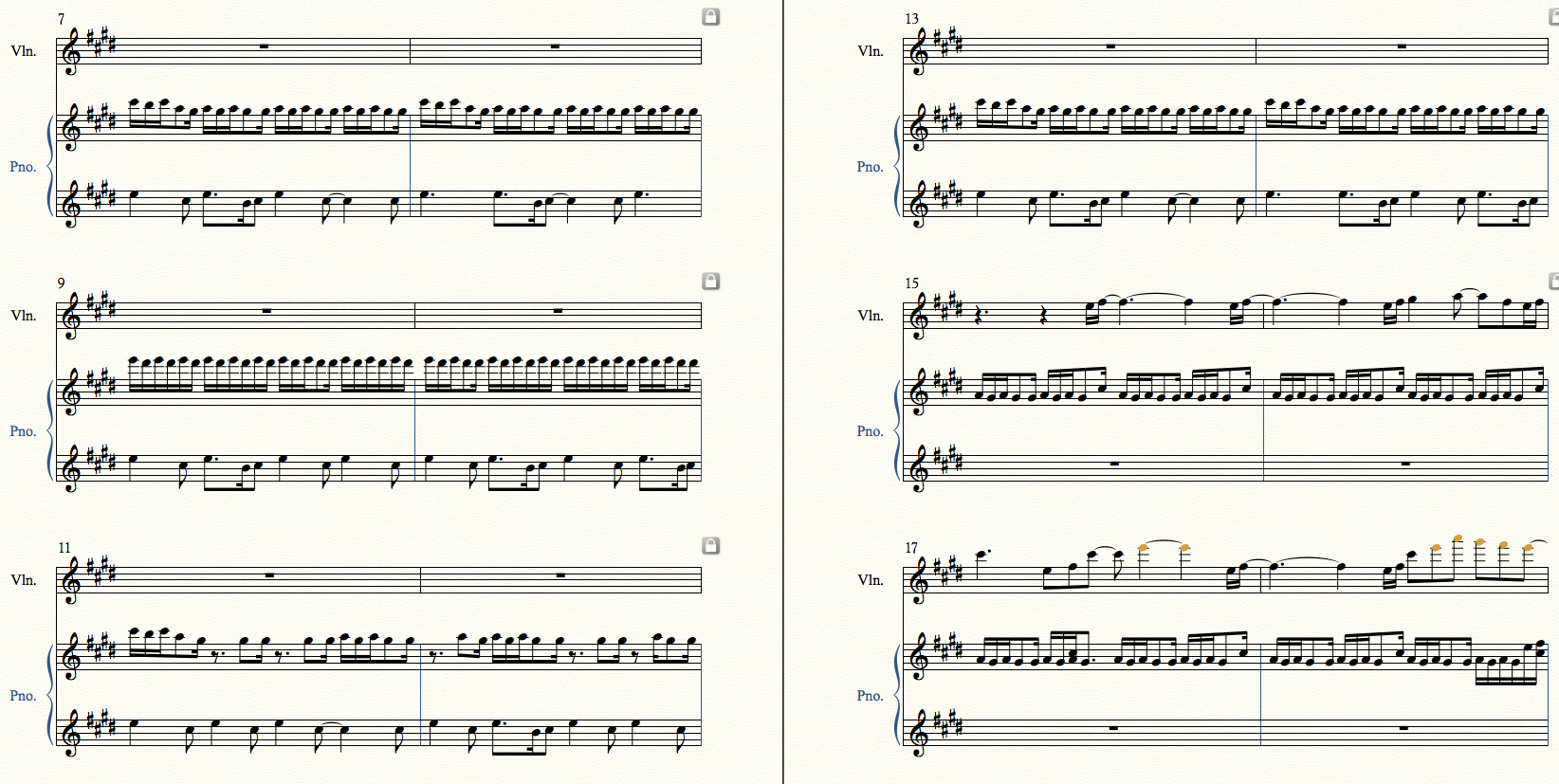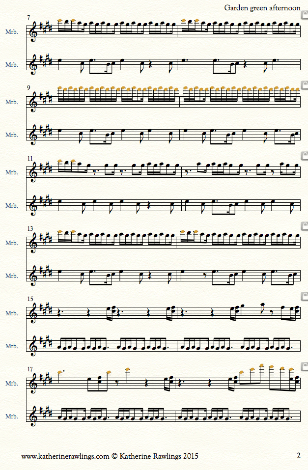 I'm still undecided on instrumentation and so I experimented with two different instrumental arrangements: marimba duo (one marimba two players); violin and piano. Though I like the idea of using marimba, my concern is that the high notes I have used wont resonate enough to do justice to the musical motives I have used. A way around this which I will consider is to transpose the material down an octave, but I like the brightness of the high pitches. It conveys to me a feeling of innocence and beauty. An example of the two arrangements are shown in the following examples: figure 5.1 and 5.2.